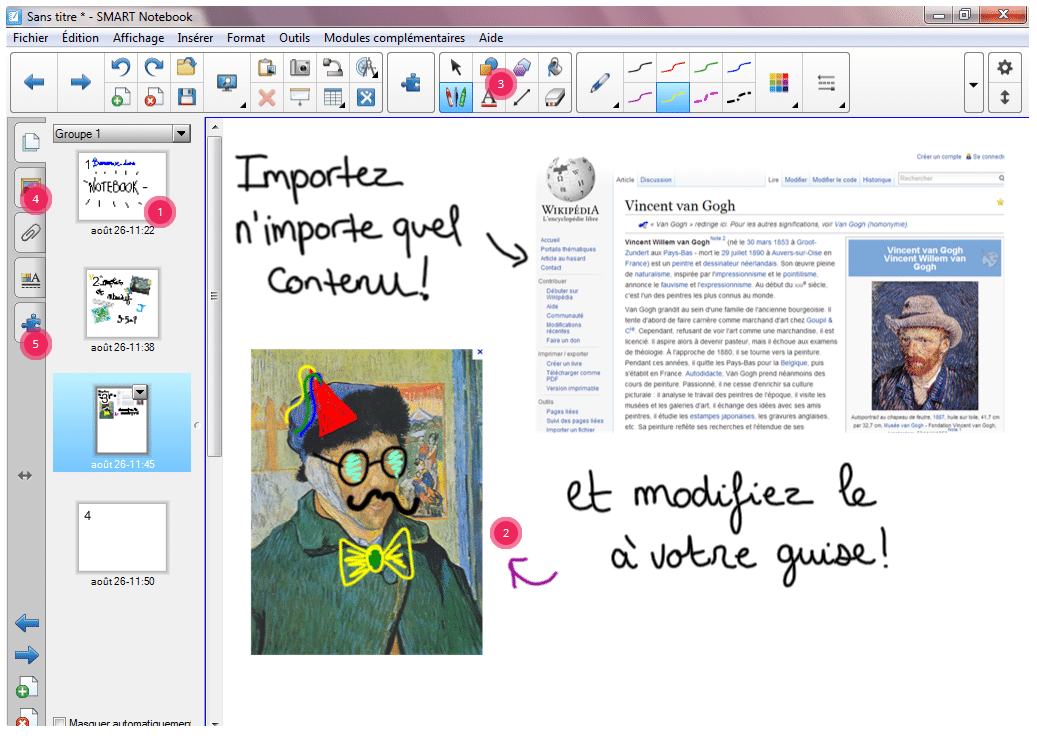 SMART Notebook fonctionne comme un tableau blanc numérique avec un système de pages (l'équivalent des diapos sur Powerpoint).