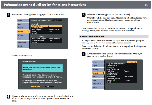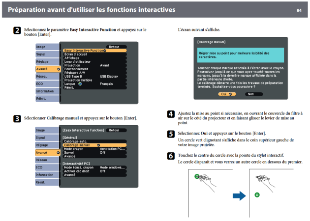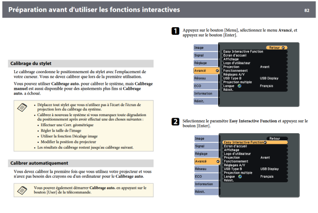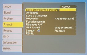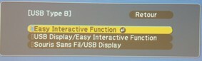 Dans le menu du vidéoprojecteur, aller dans Avancé->USB type B et choisir Easy Interactive Function